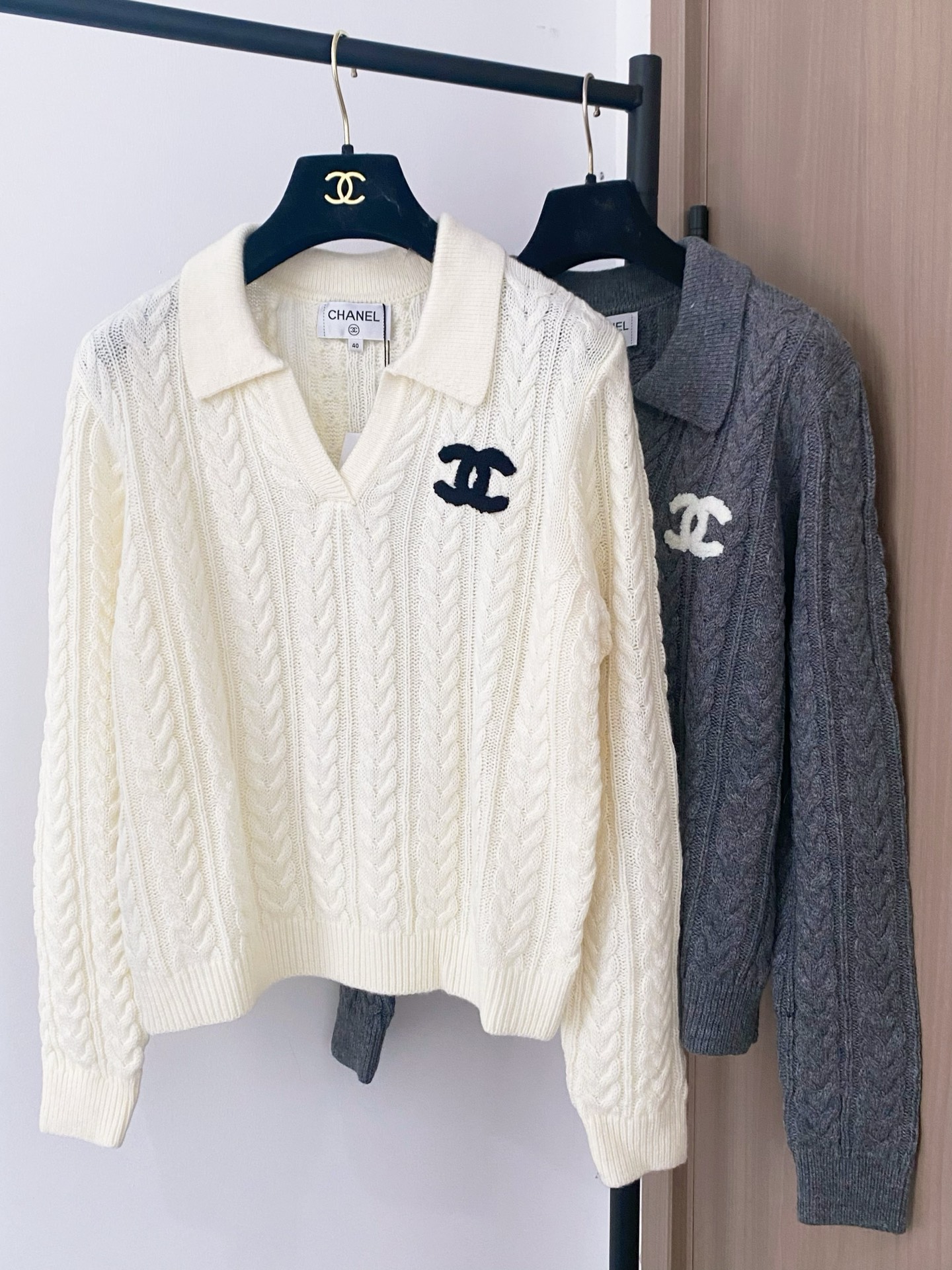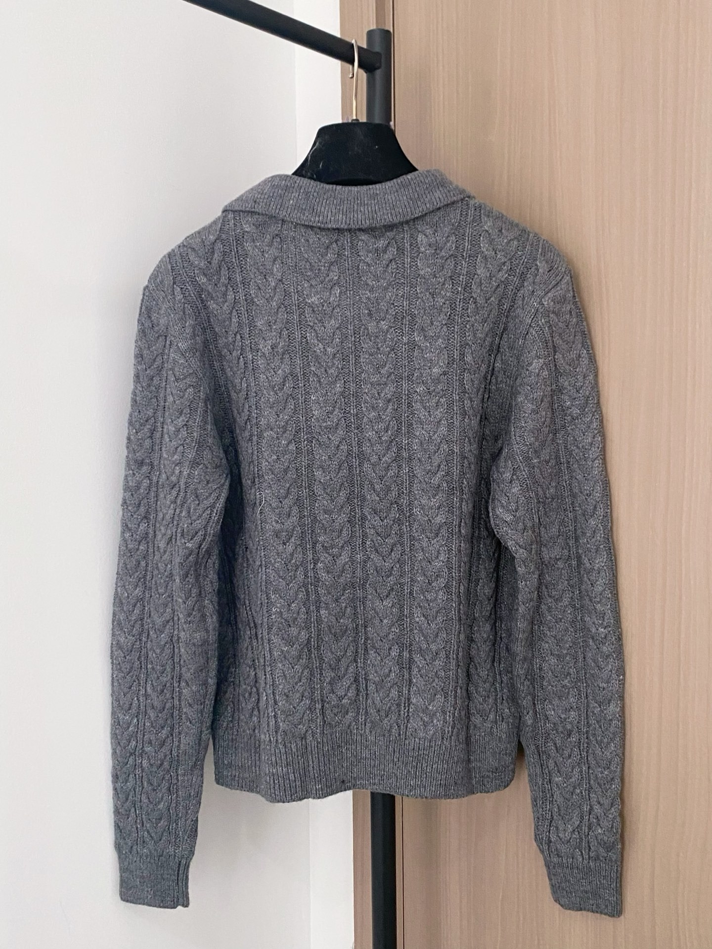 Tags: Chanel Gebreide Trui, Dames Polo Trui, Designer trui grijs, Gebreide polo met logo, Lange mouwen trui dames, Luxe Dameskleding