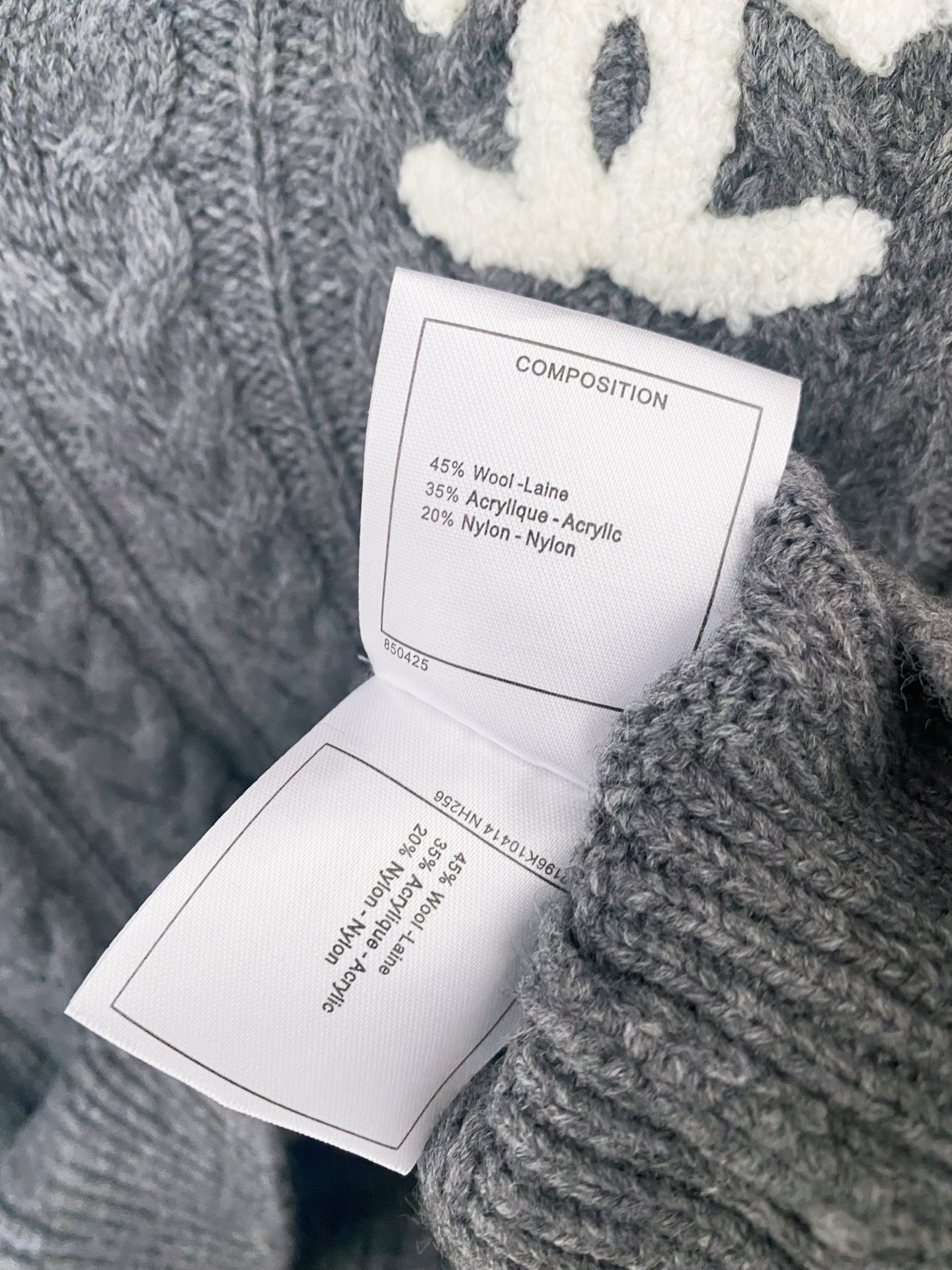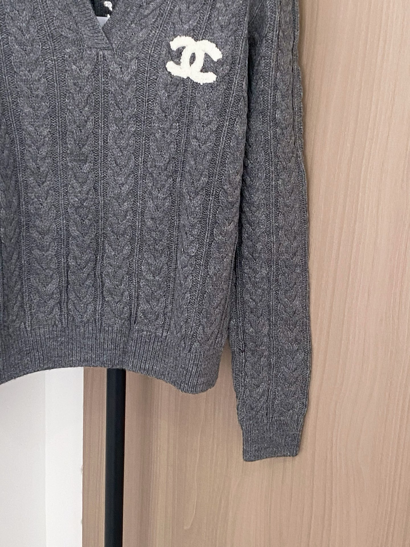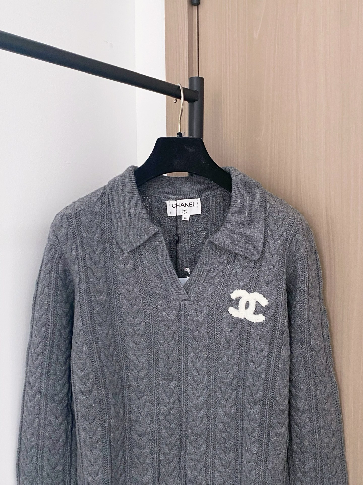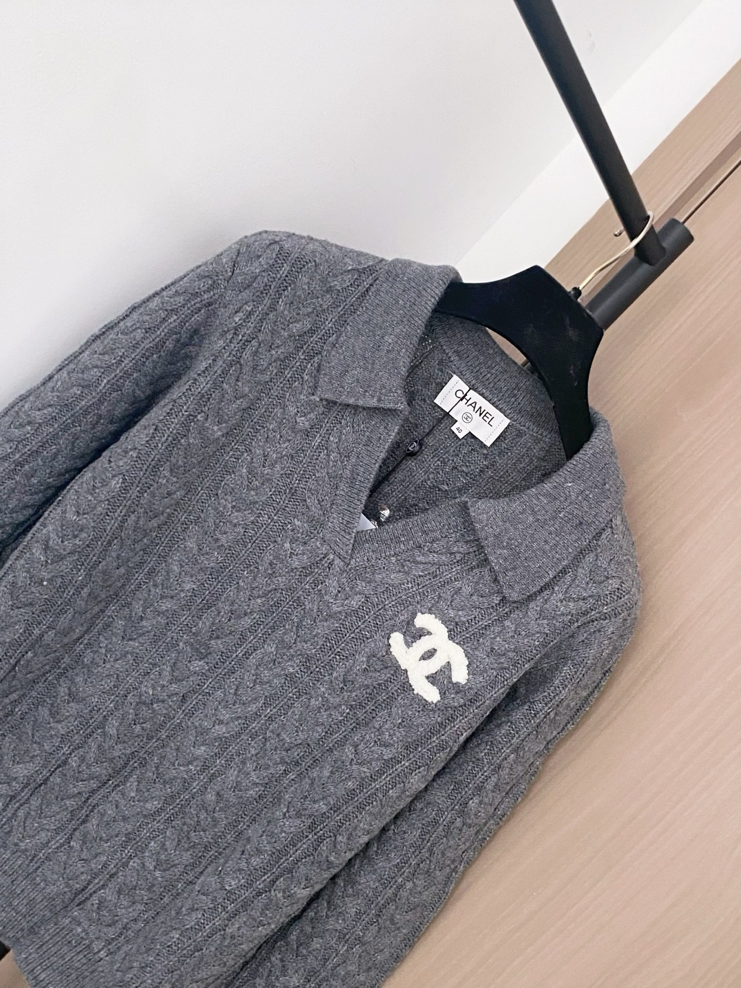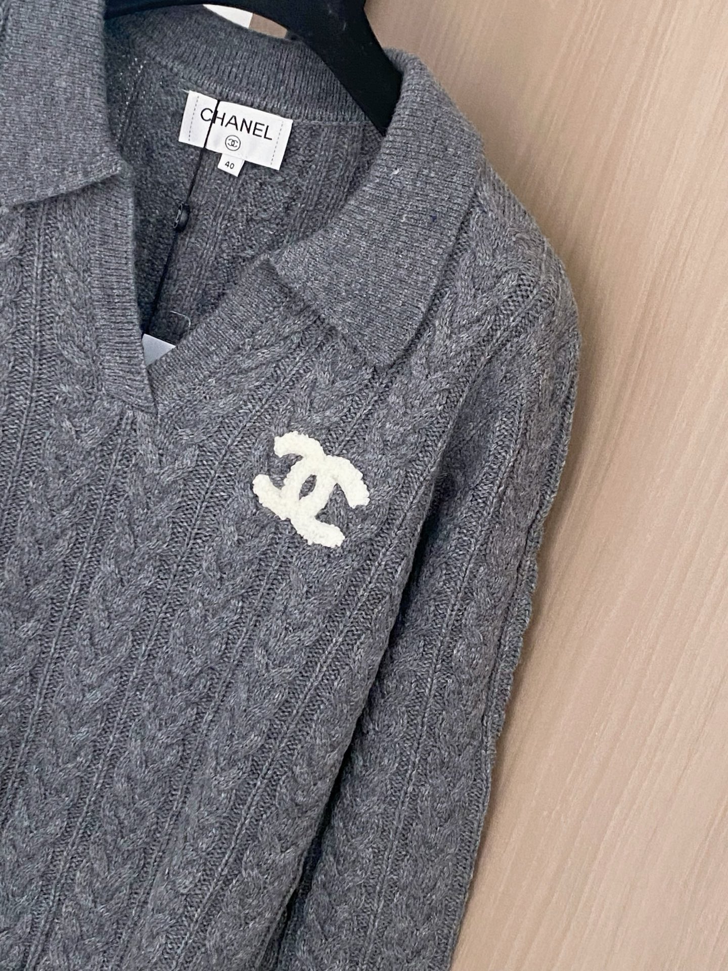 Stijlvolle grijze Chanel polo trui. Luxe uitstraling met gebreid patroon en logo. Perfect voor een elegante en comfortabele look.