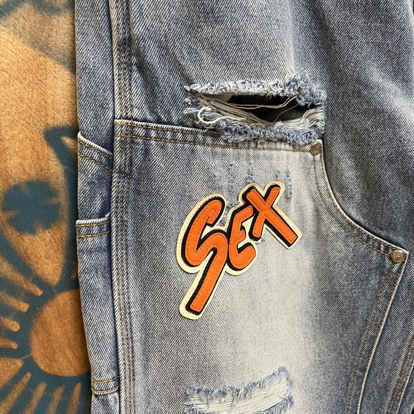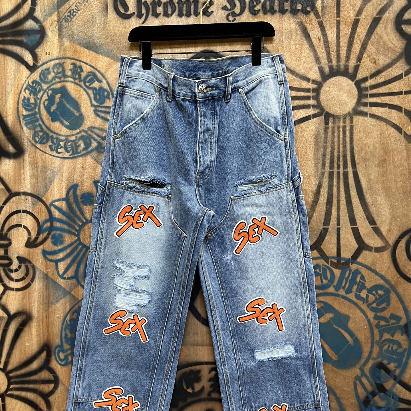 Exclusieve Chrome Hearts denim broek, een unieke remake van vintage Levi's. Limited edition met opvallende 'SEX' prints. Handgemaakt met hoogwaardige materialen.