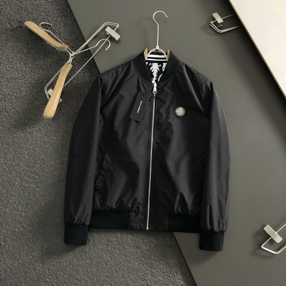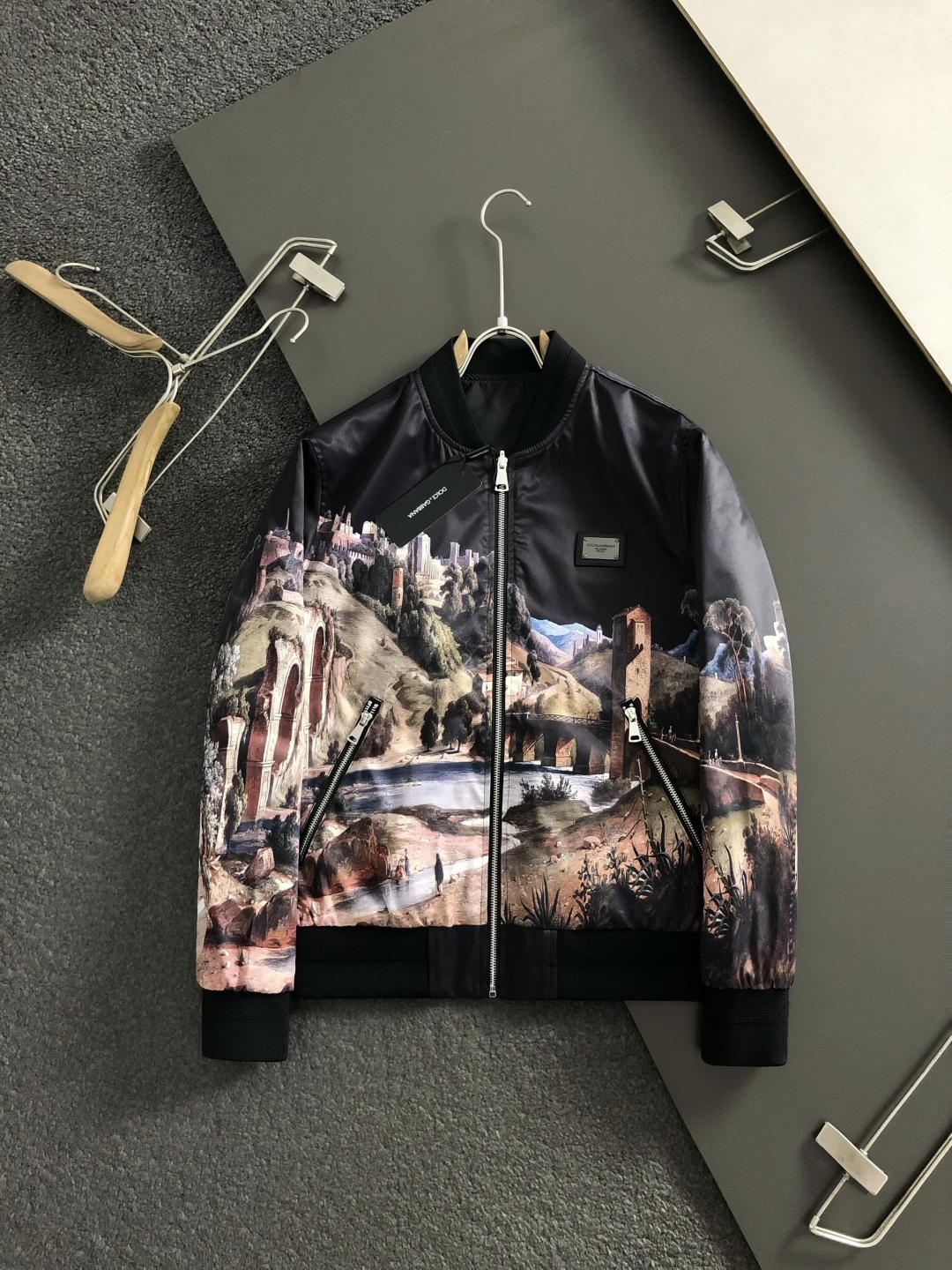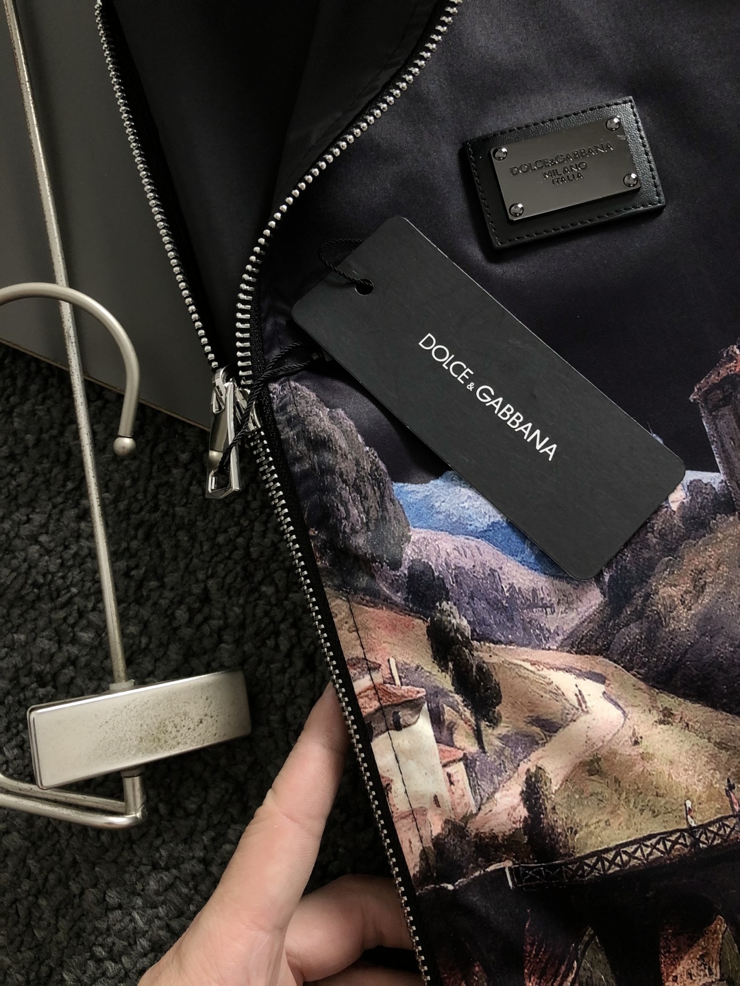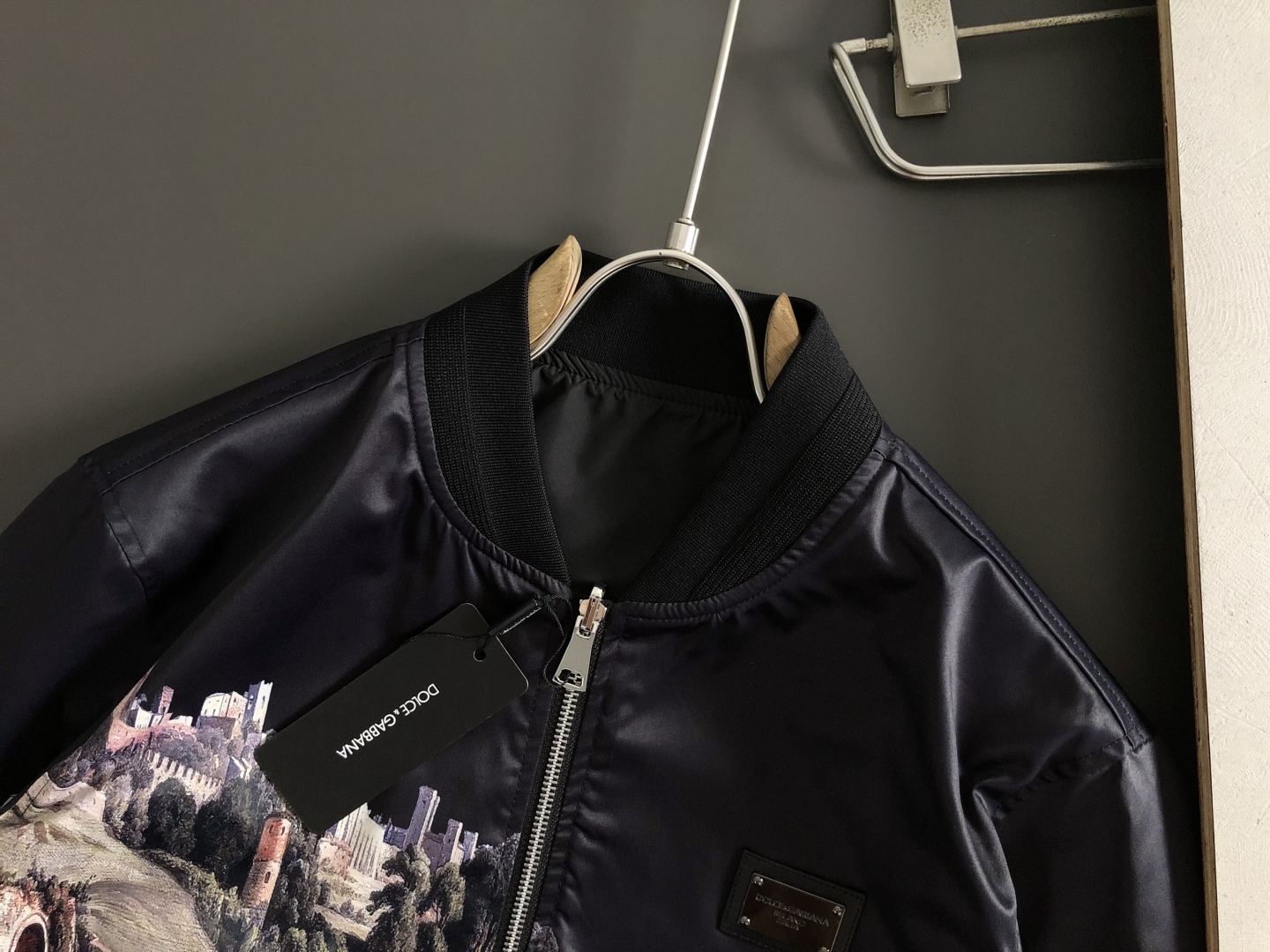 Stijlvolle Dolce & Gabbana herenjas, omkeerbaar design met barok print aan de ene kant en een effen zwarte kant met logo detail.