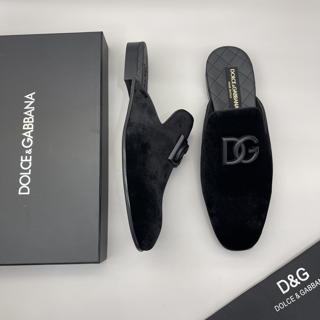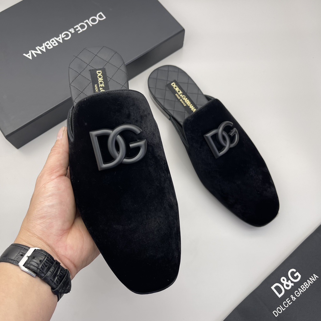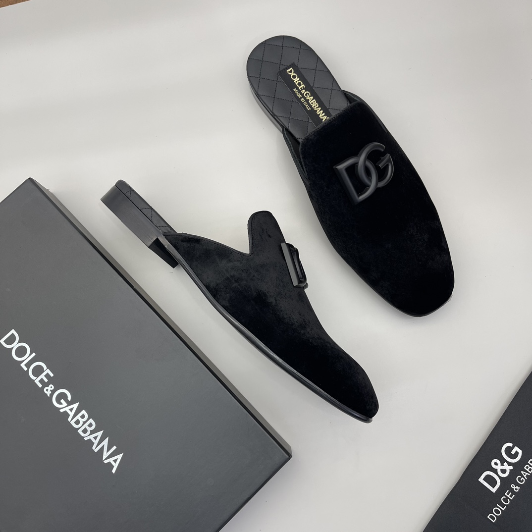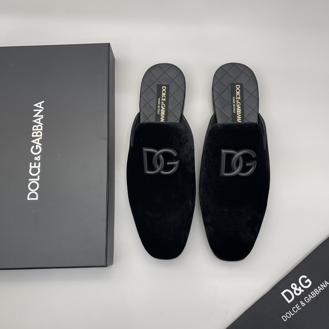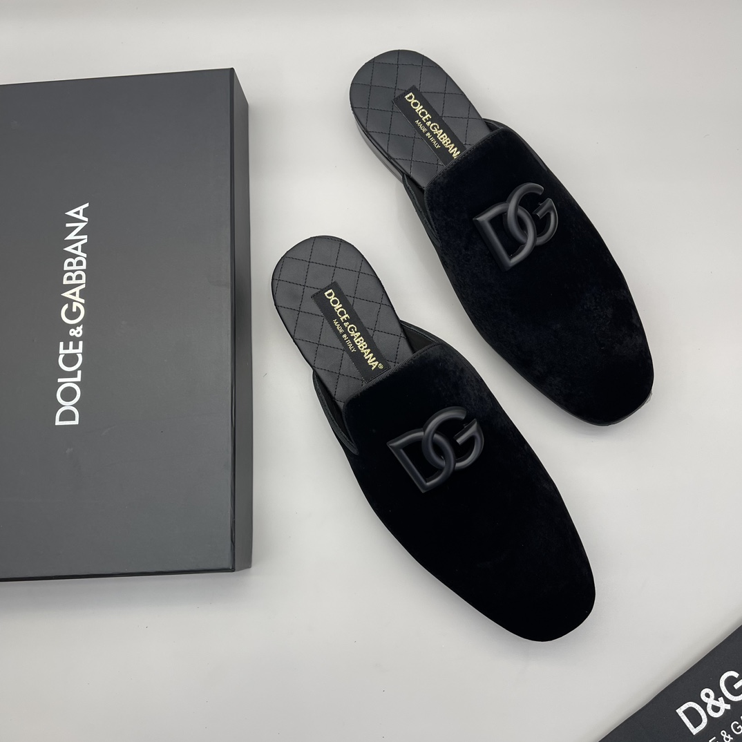 Tags: D&G Logo Mules, Designer Heren Mules, Dolce & Gabbana Mules, Elegante Heren Slippers, Luxe Heren Schoenen, Zwarte Velvet Schoenen