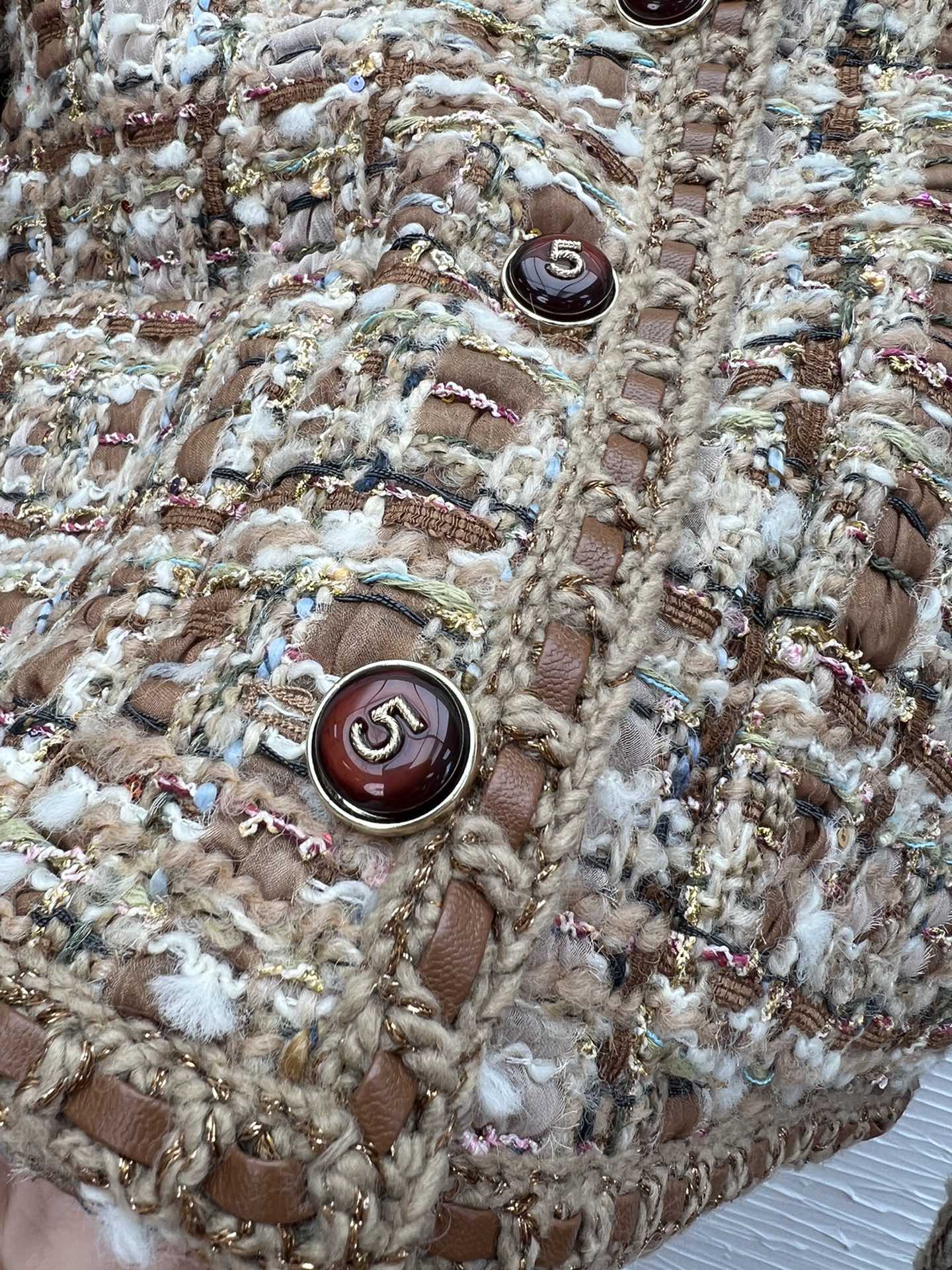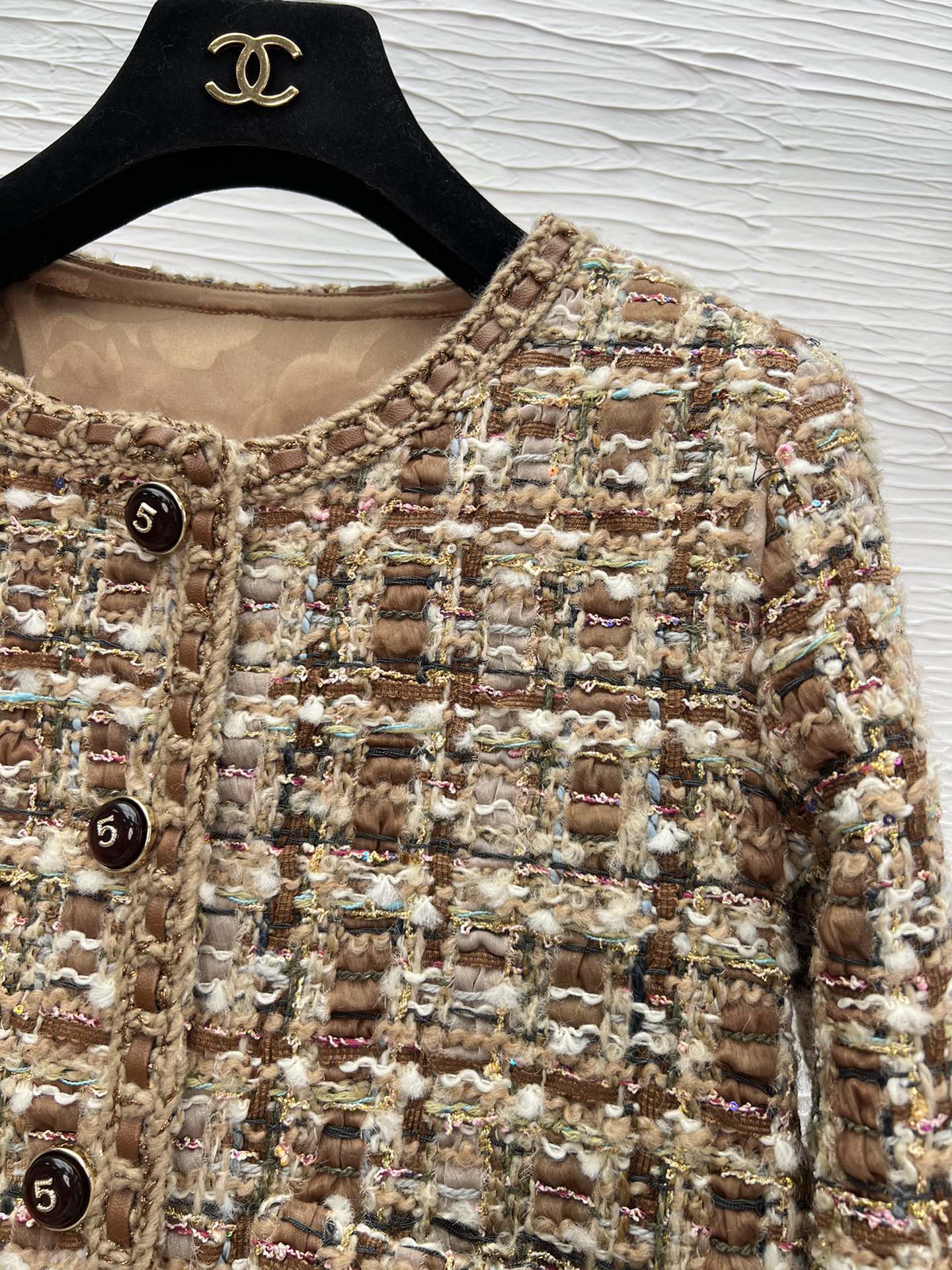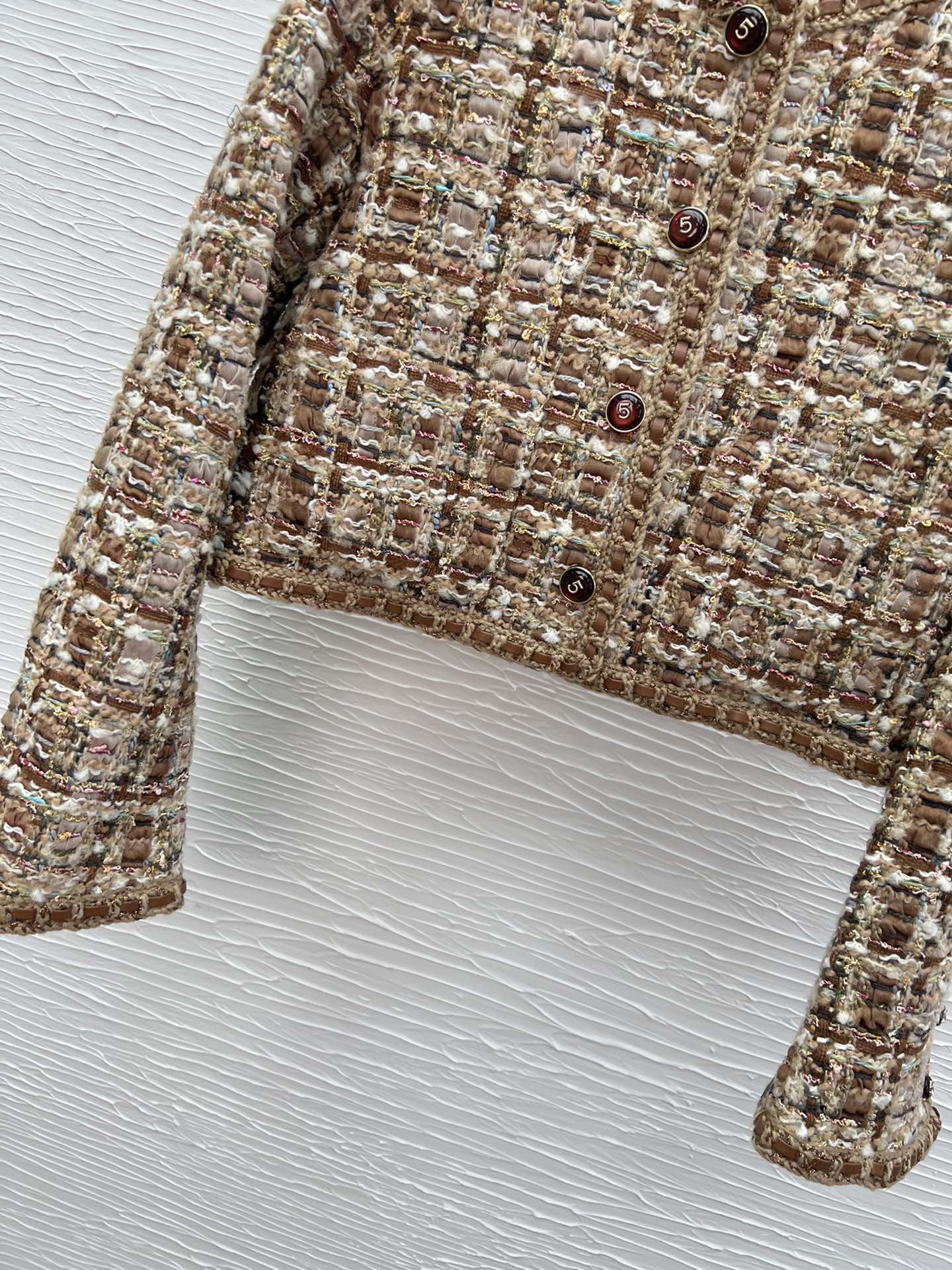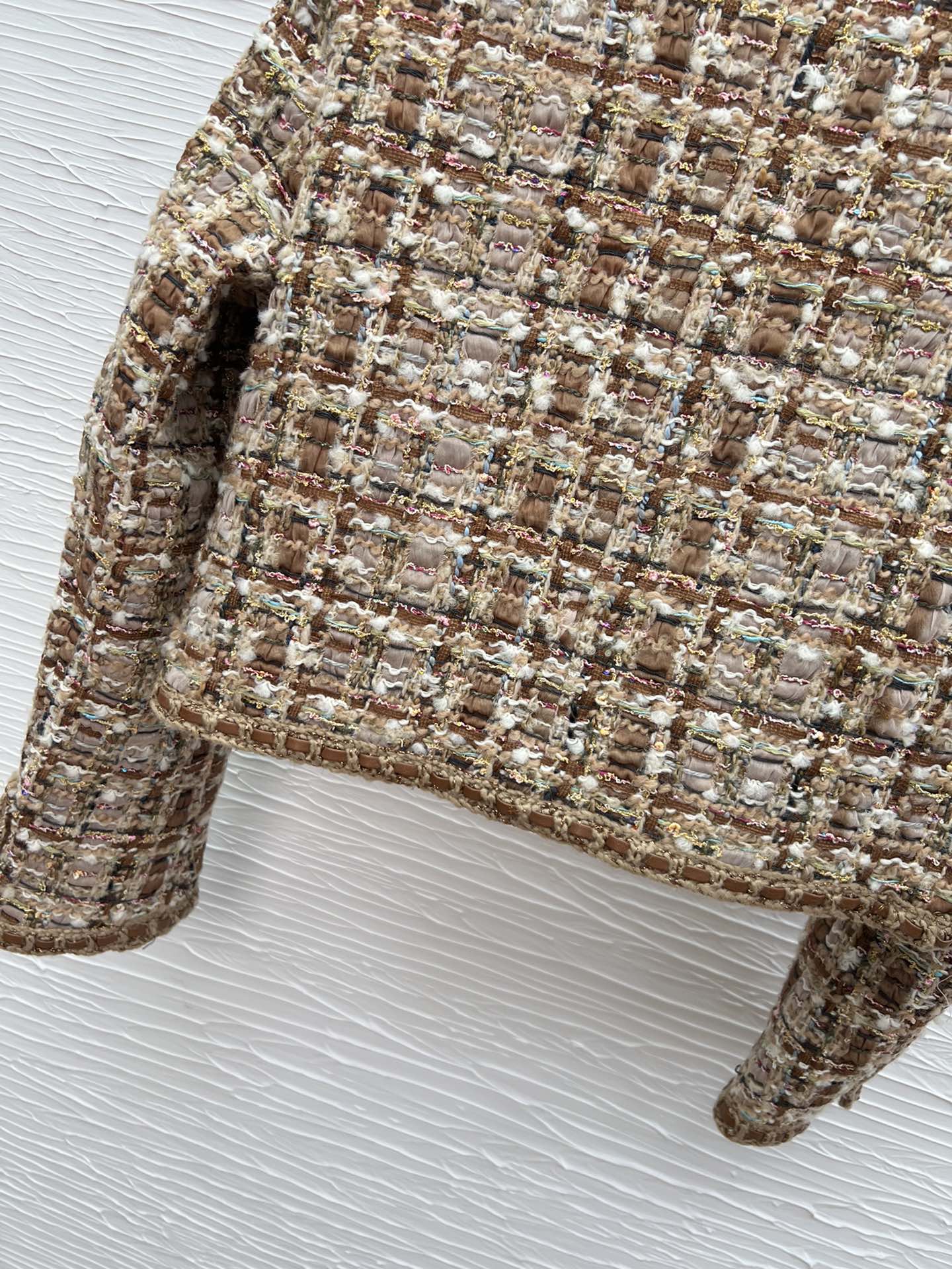 Tags: Bruine Damesjas, Chanel Tweed Jas, Designer Jas Dames, Elegante Dameskleding, Luxe Bovenkleding, Stijlvolle Tweed Jas