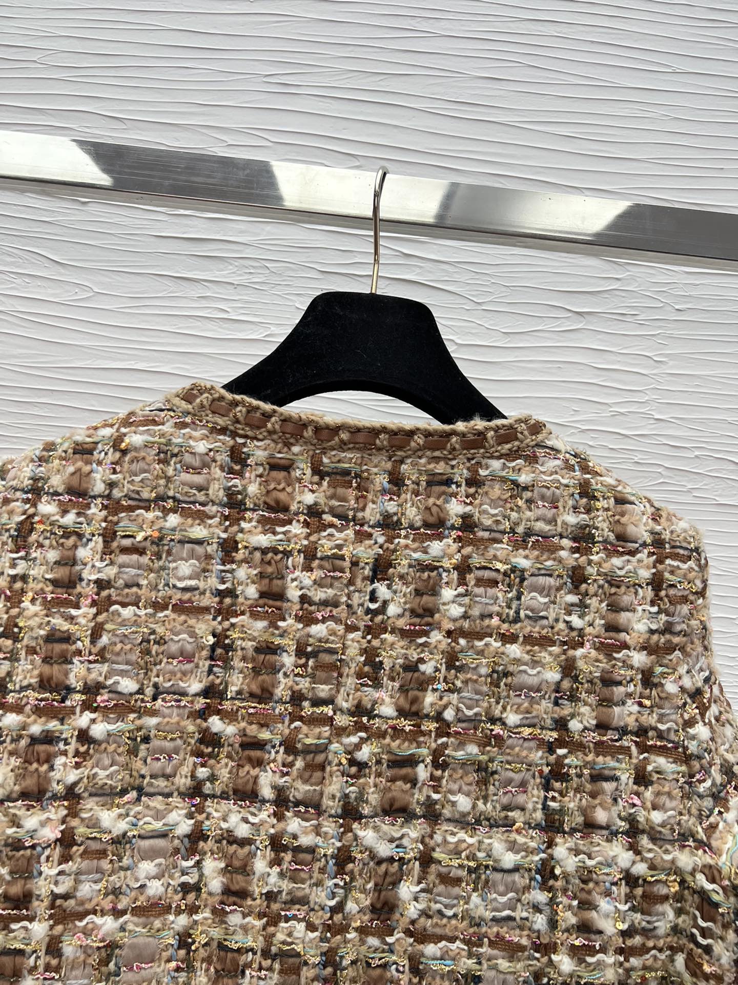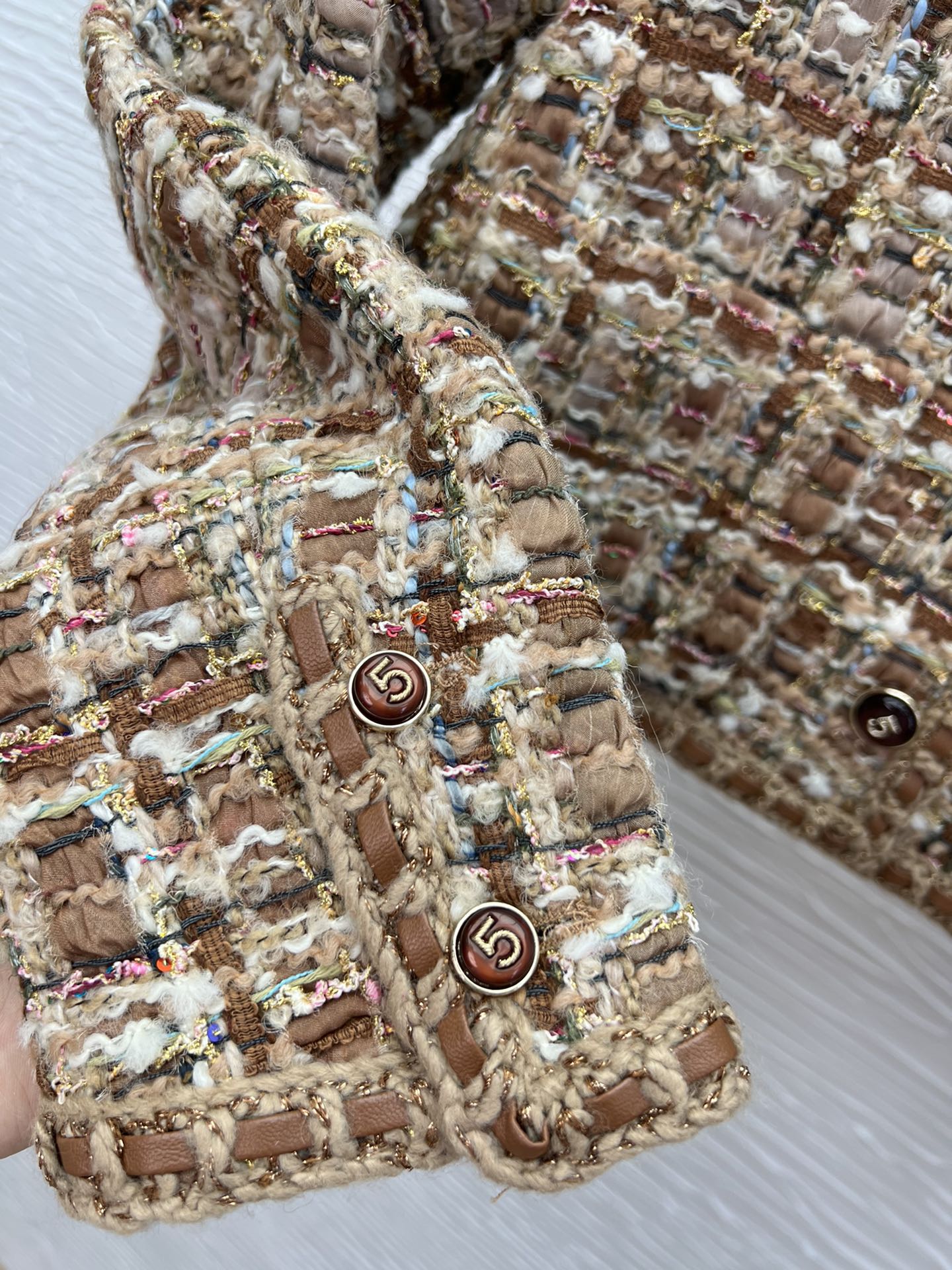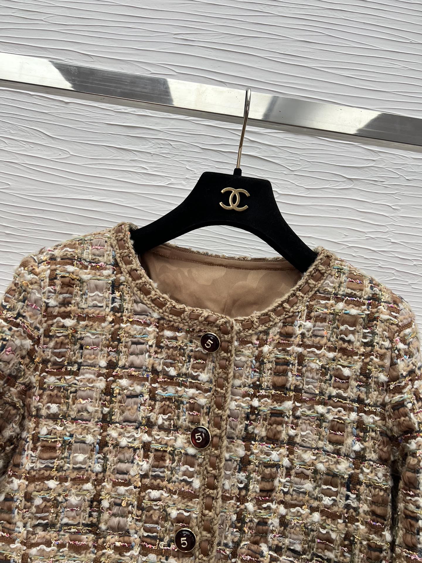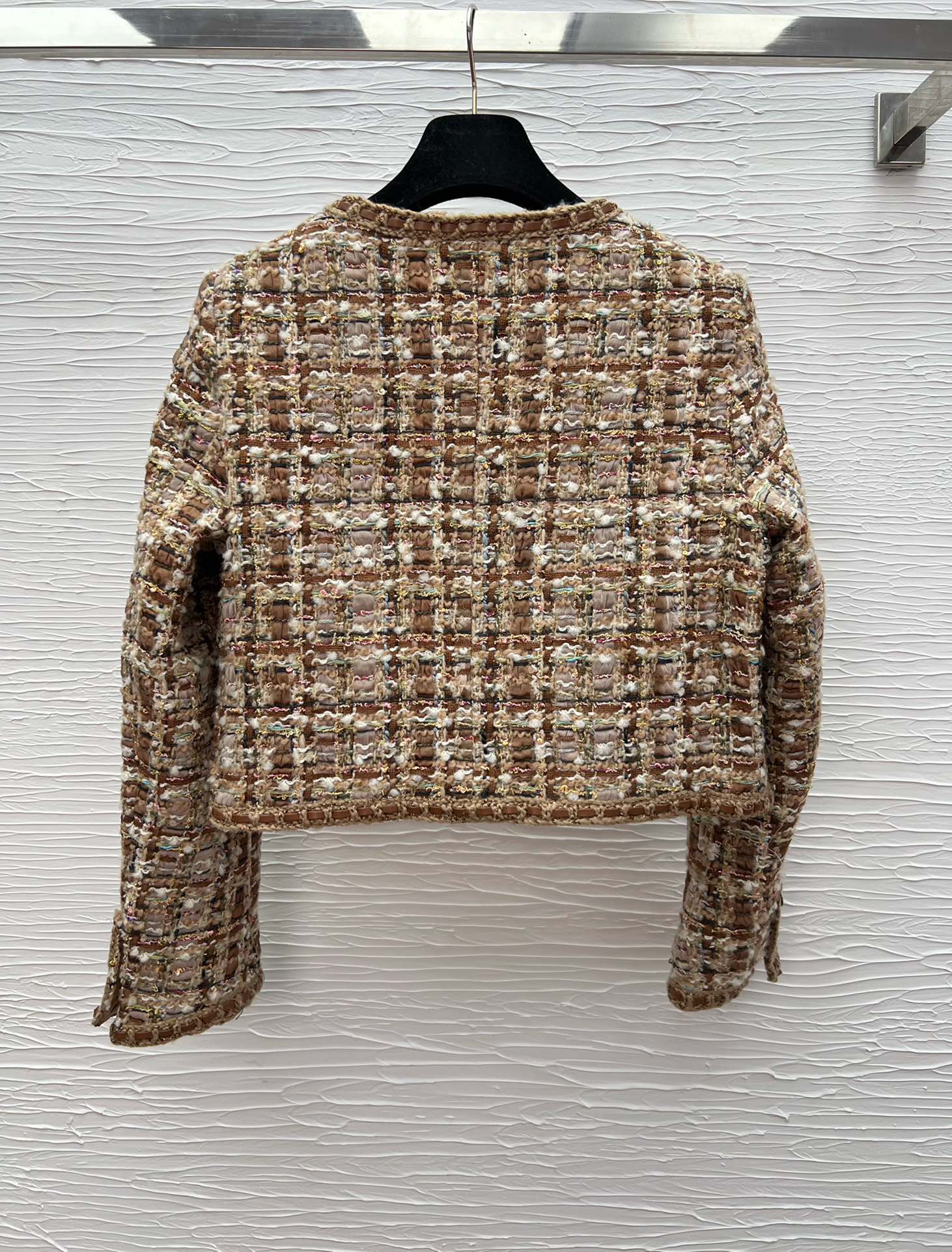 Tags: Bruine Damesjas, Chanel Tweed Jas, Designer Jas Dames, Elegante Dameskleding, Luxe Bovenkleding, Stijlvolle Tweed Jas