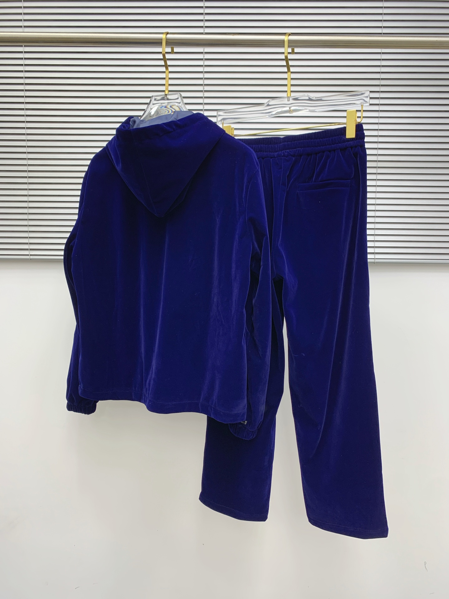 Ervaar luxe met dit Louis Vuitton trainingspak. Gemaakt van zacht blauw velours, met capuchon, logo details en een comfortabele pasvorm. Perfect voor een stijlvolle, relaxte look.