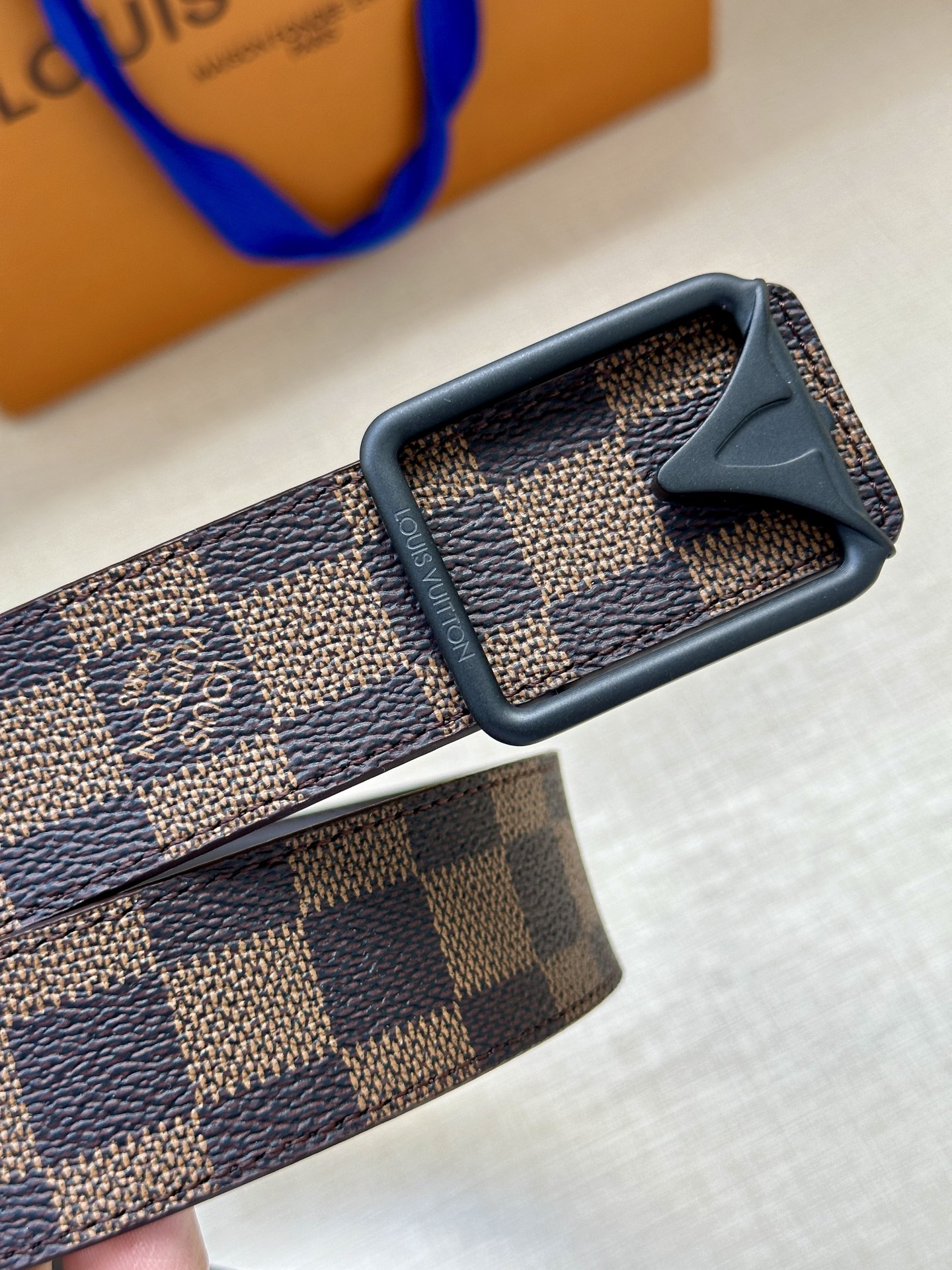 Stijlvolle Louis Vuitton riem met de iconische Initiales gesp en vervaardigd uit Damier Ebene canvas en soepel leer.