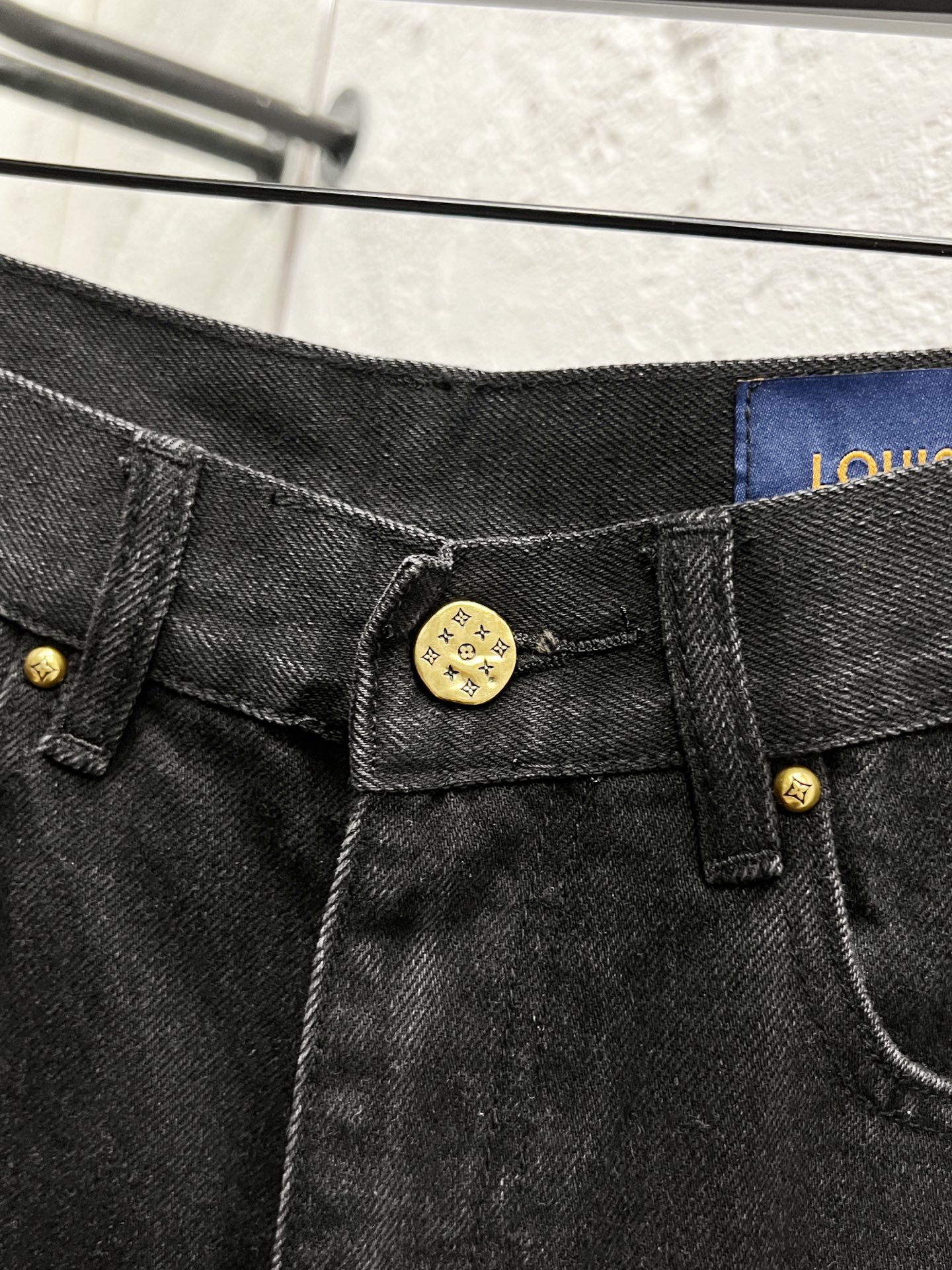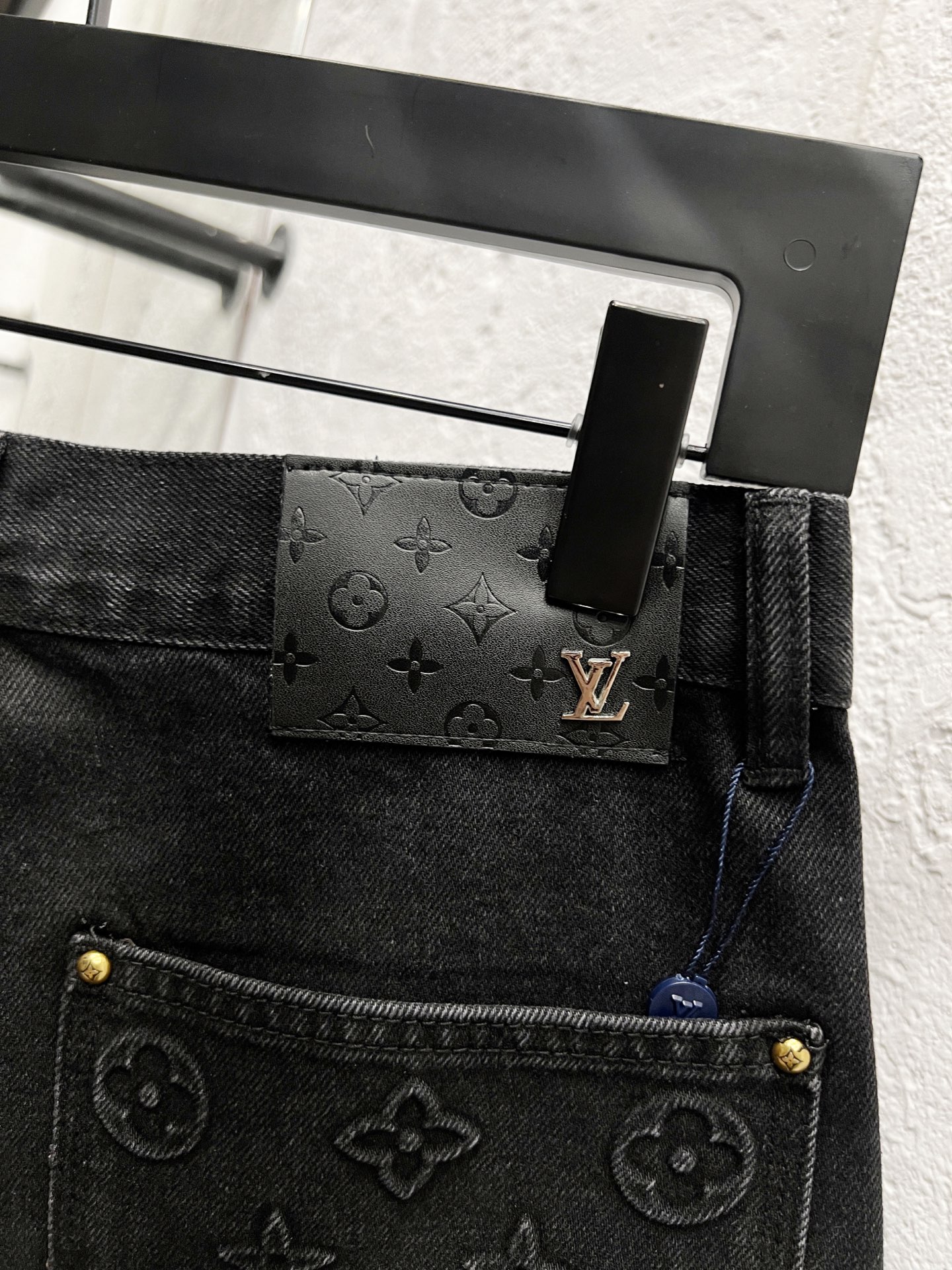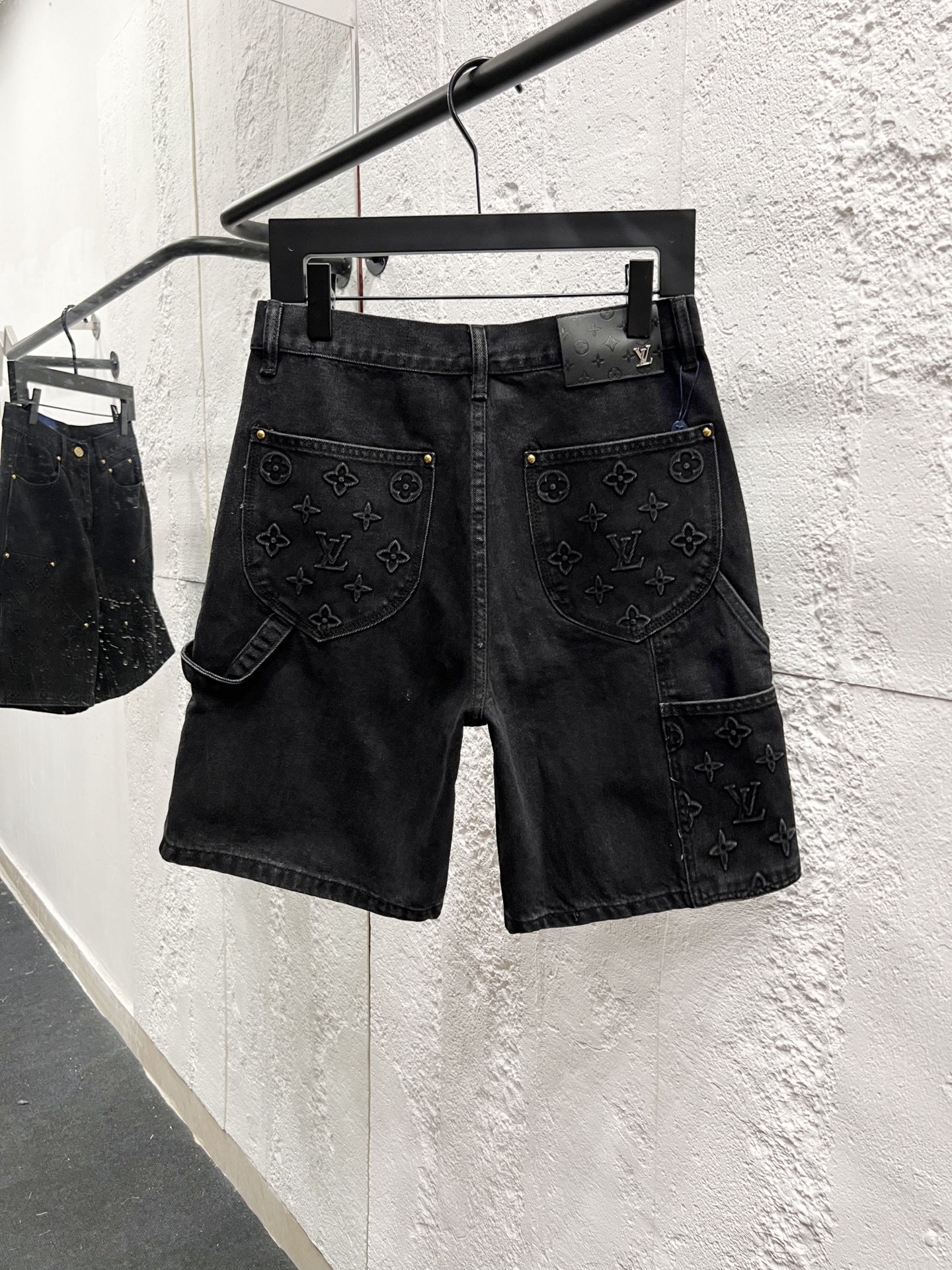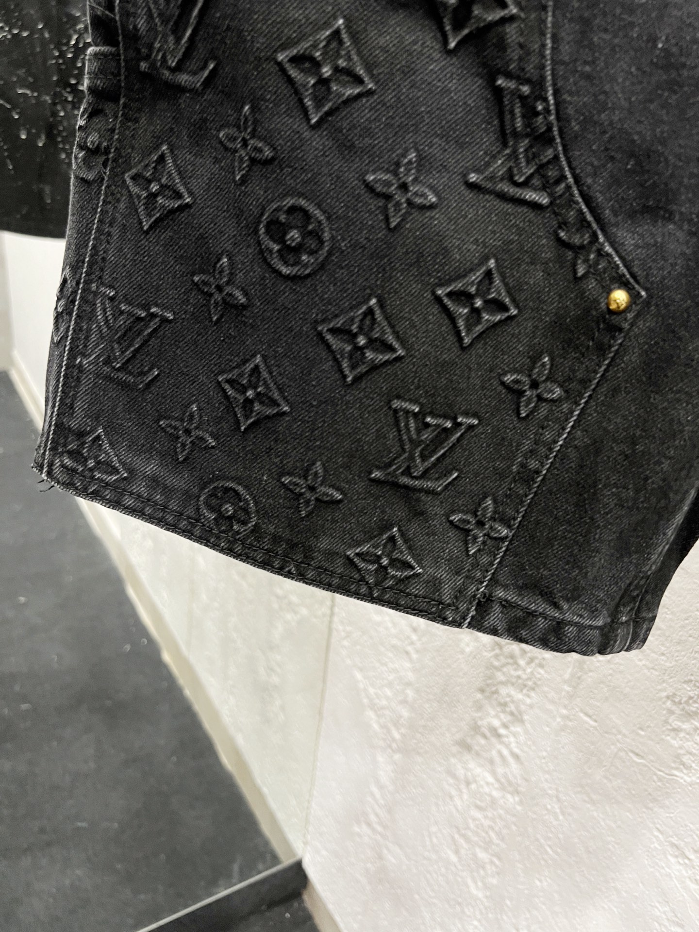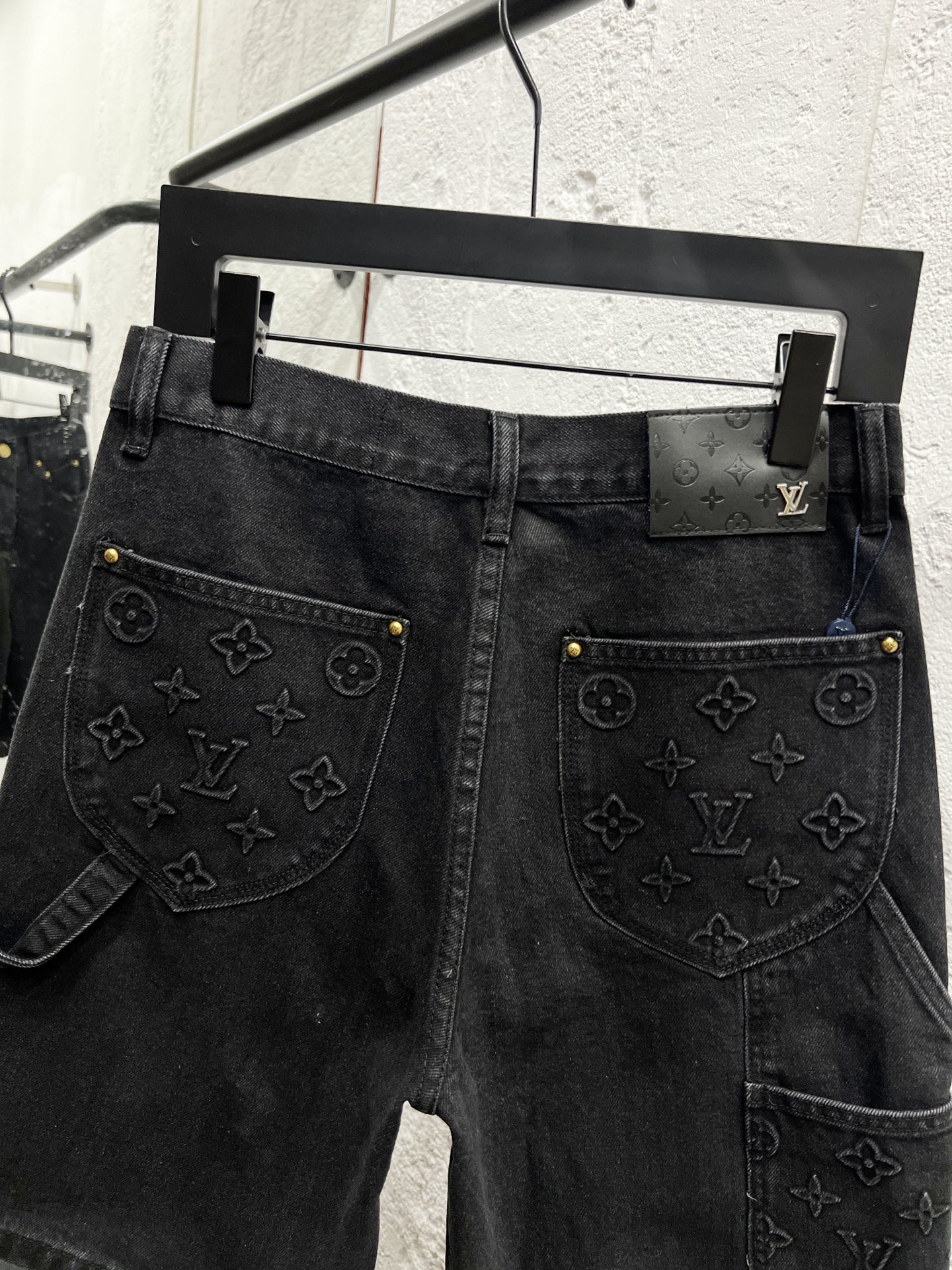 Deze stijlvolle zwarte denim werkshorts van Louis Vuitton zijn een must-have voor elke modeliefhebber. Met een uniek monogram reliëf bieden ze een exclusieve uitstraling.