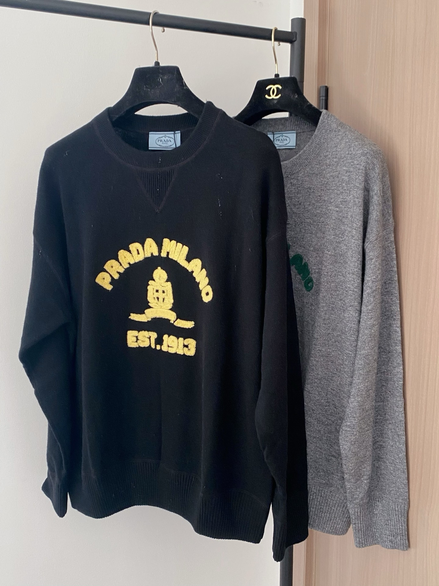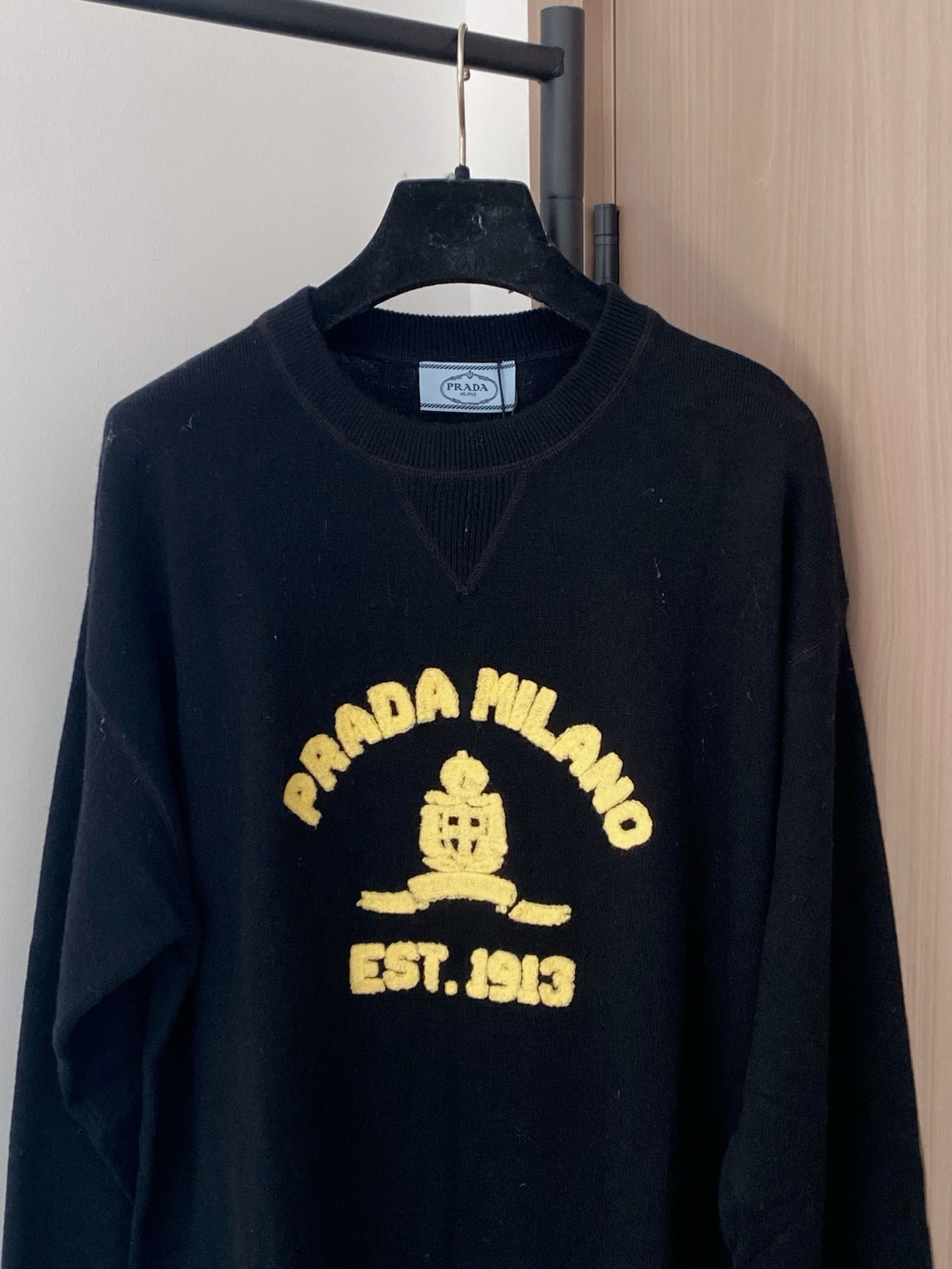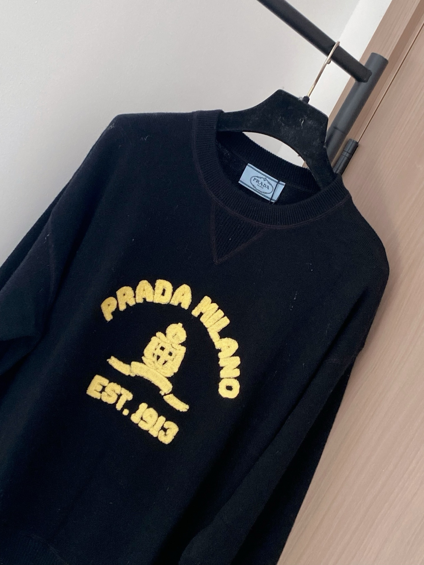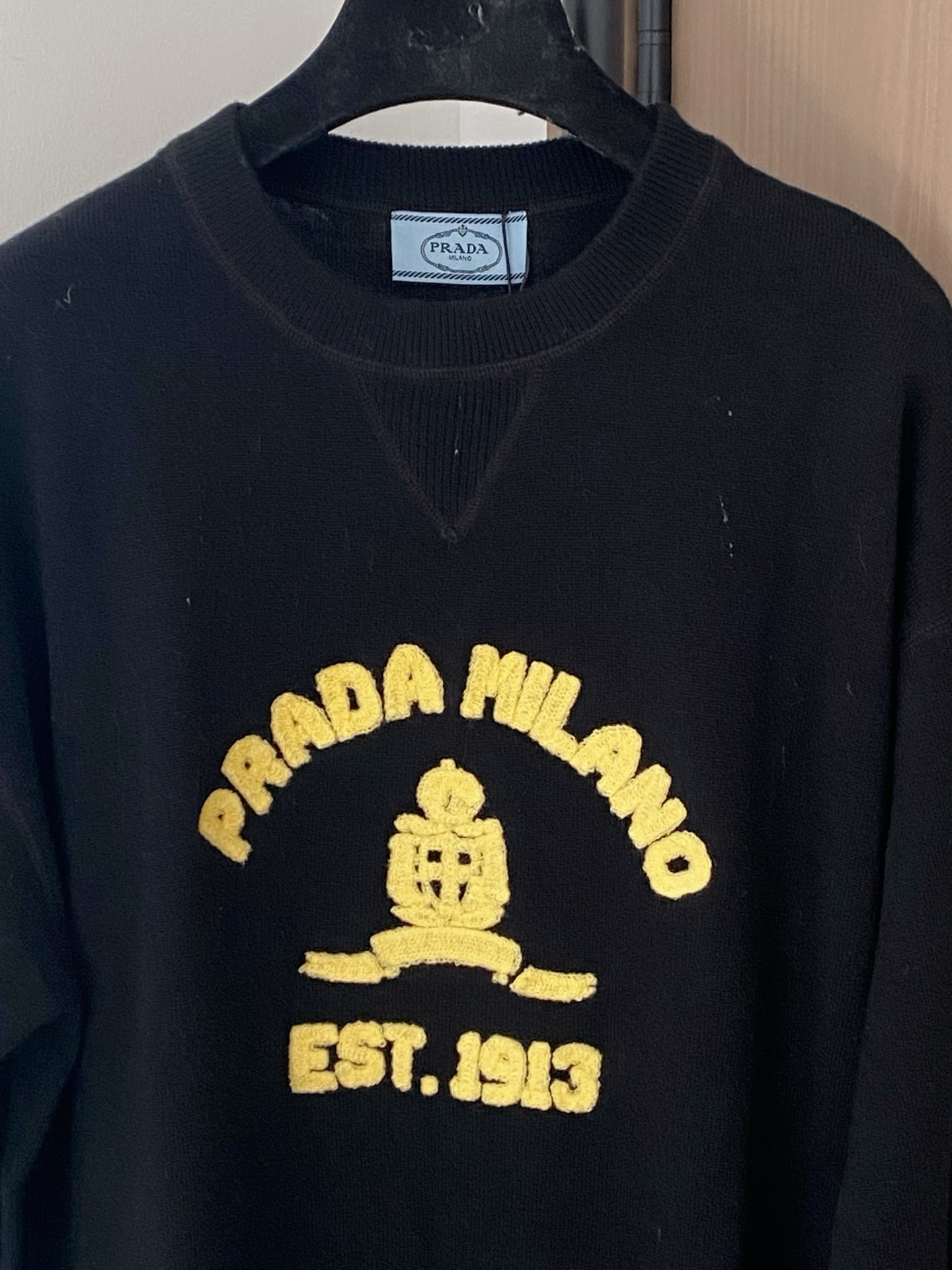 Tags: Casual Chic Trui, Designer Trui, Geborduurde Logo Trui, Lange Mouw Trui, Prada trui, Zwarte Trui Dames