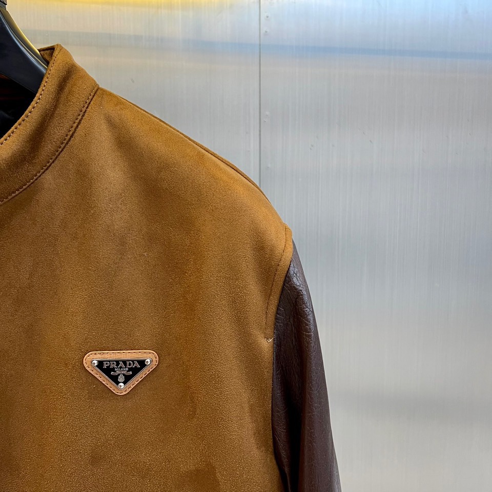 Retro-moderne Prada suède jack met leren accenten. Perfect voor een stijlvolle, veelzijdige look. Hoogwaardige materialen en Italiaans design.
