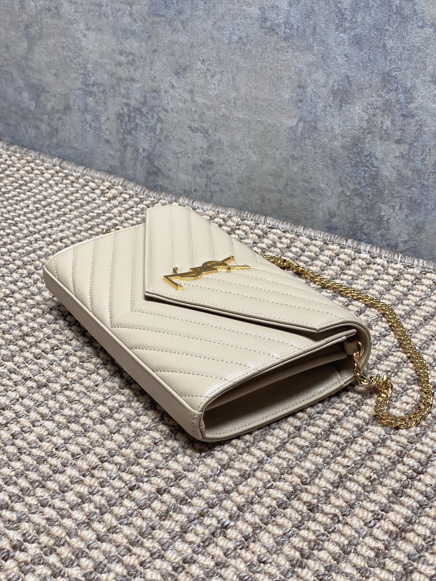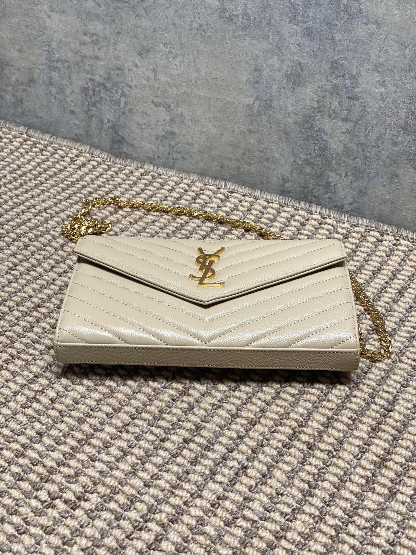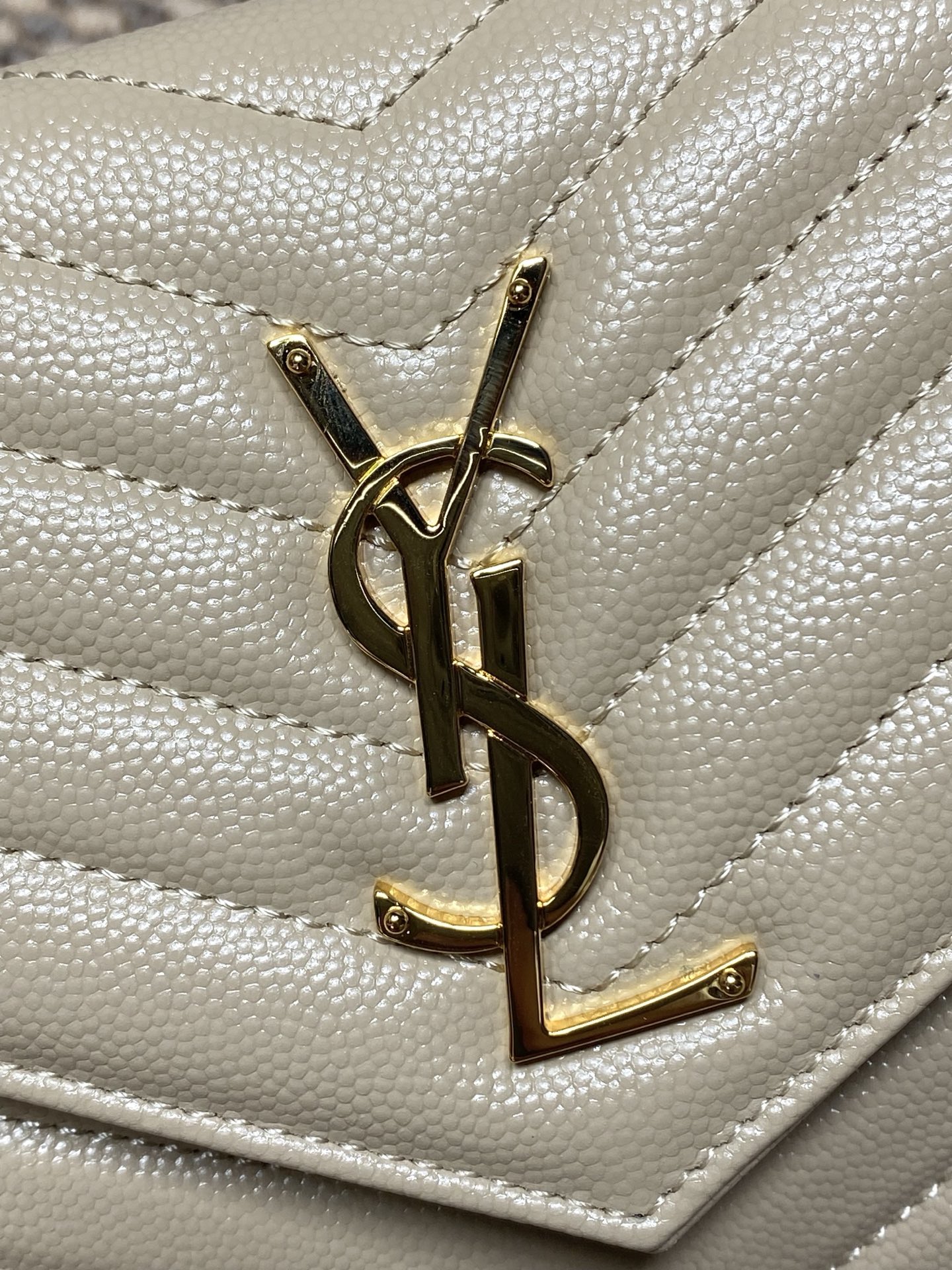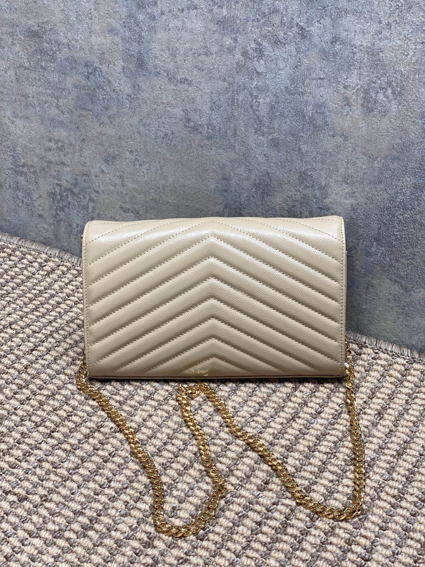 Elegante YSL Loulou kettingtas van beige leer. Perfect als handtas of schoudertas met 20 vakken. Afmetingen: 22,5 x 14 x 4 cm.
