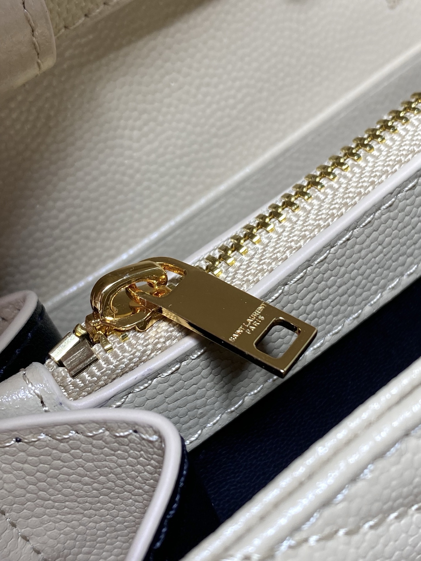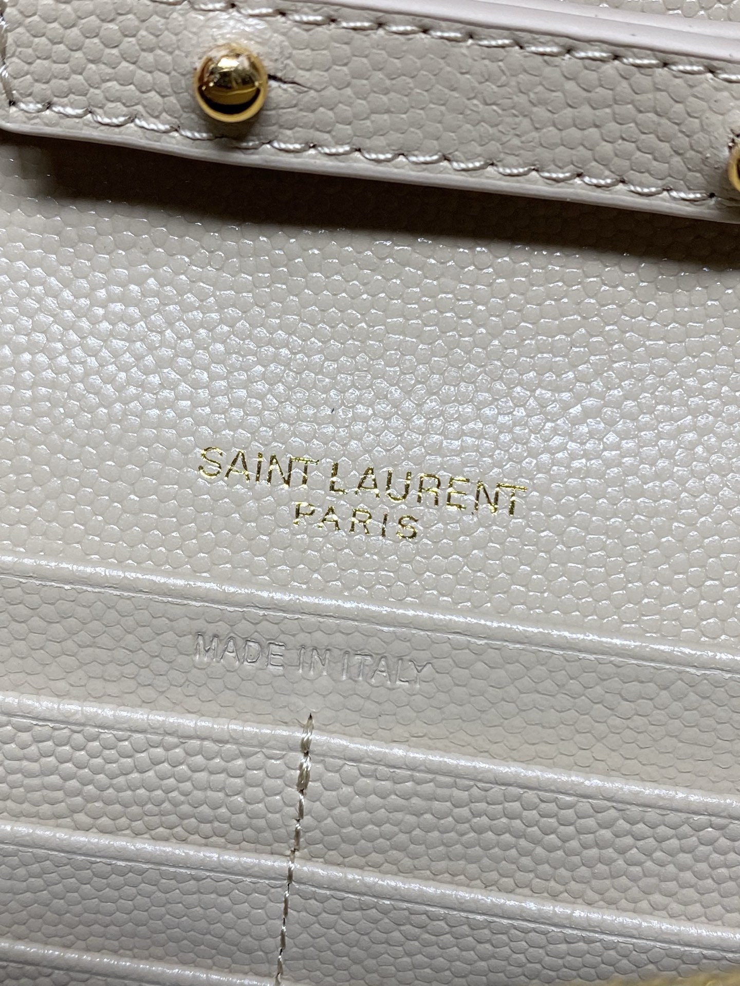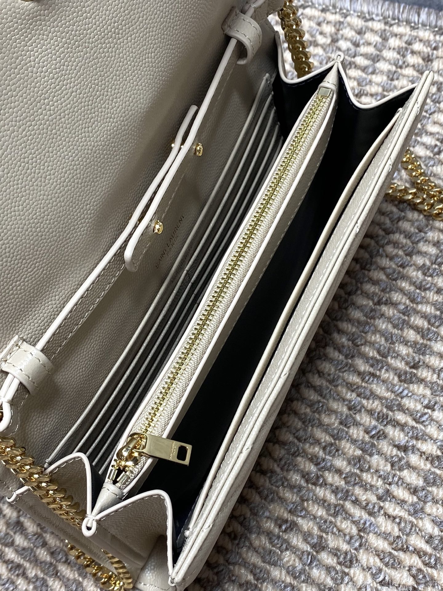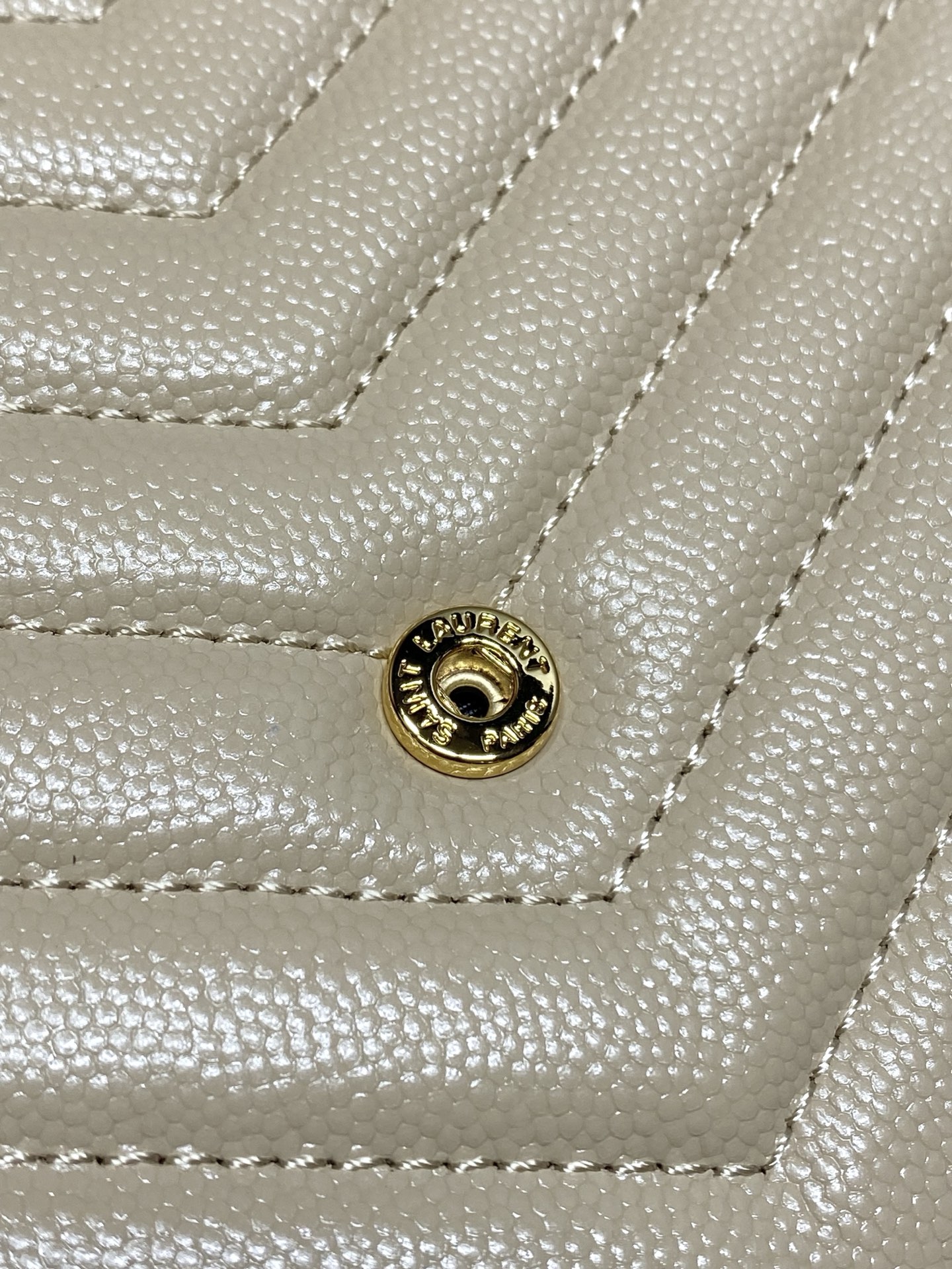 Elegante YSL Loulou kettingtas van beige leer. Perfect als handtas of schoudertas met 20 vakken. Afmetingen: 22,5 x 14 x 4 cm.